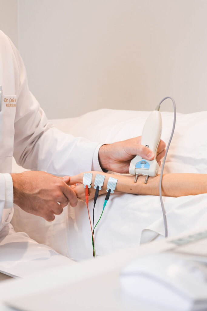 A eletroneuromiografia (ENMG) é um exame que avalia o funcionamento dos nervos e dos músculos, ajudando a identificar a origem de sintomas como dor, formigamento, dormência, fraqueza muscular ou cãibras. Por meio de estímulos elétricos leves e do registro da atividade muscular, o exame permite ao médico verificar se há alterações nos nervos periféricos, nos músculos ou na comunicação entre eles. A ENMG é indicada na investigação de doenças neuromusculares, como neuropatias, compressões de nervos (por exemplo, síndrome do túnel do carpo), miopatias e doenças do neurônio motor, auxiliando no diagnóstico preciso e na definição do melhor tratamento. No Instituto NeuroFerraz, o exame é realizado por médicos neurologistas com ampla experiência, o que garante uma avaliação cuidadosa, interpretação especializada dos resultados e maior precisão no diagnóstico diferencial das doenças neuromusculares.